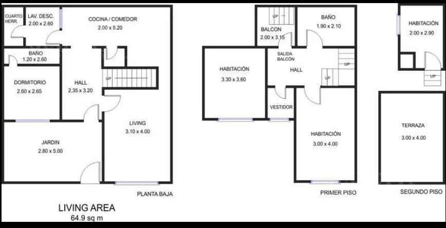 PB: Hall de entrada – Living comedor – Cocina -Dormitorio con baño completo en Suite – Patio con lavadero y cuarto de herramientas.